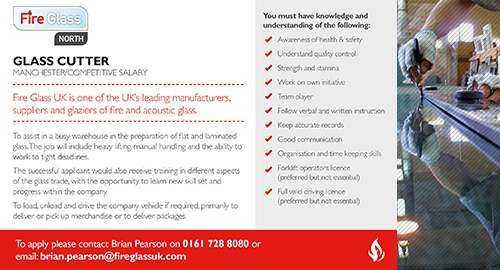 <<< BACKWe are recruiting! Jun2016 Homepage > We are recruiting! POSITION: GLASS CUTTER LOCATION: FIRE GLASS NORTH – MANCHESTER Fire Glass UK’s North Branch in Manchester is recruiting. To assist in a busy warehouse in the preparation of flat and laminated glass. The job will include heavy lifting, manual handling and the ability to work to tight deadlines. The successful applicant would also receive training in different aspects of the glass trade, with the opportunity to learn new skill set and progress within the company. THE SUCCESSFUL APPLICANT MUST POSSESS SKILLS AND EXPERIENCE IN: > Awareness of health & safety > Understand quality control > Strength and stamina > Work on own initiative > Team player > Follow verbal and written instruction > Keep accurate records > Good communication > Organisation and time keeping skills For more information on this position, or to apply please contact Brian Pearson on 0161 728 8080 or email: brian.pearson@fireglassuk.com www.fireglassuk.com Please share on your network: Oct 2025 SPOT OUR GLASS: WALSALL MANOR HOSPITAL Oct 2025 WE DELIVER WHAT MATTERS: NEW BRANDED VANS HIT THE … Jul 2025 Spot Our Glass: Ferdotti Motor Services, W … Jun 2025 SPOT OUR GLASS: CHESTER